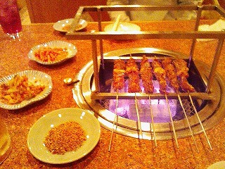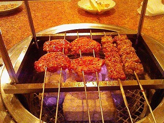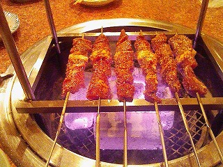 羊肉を独特のスパイスで味付された串を、ハングル語が書いてあるロースターで自分で焼くという、一風変わった料理、韓国料理でもないこの店、かなりお勧めだ!