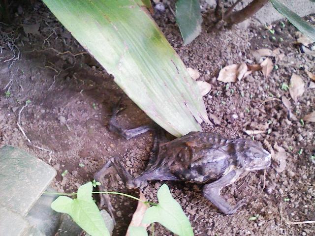 デカイ蛙が干からびていました。今年の夏は暑かったからなー。