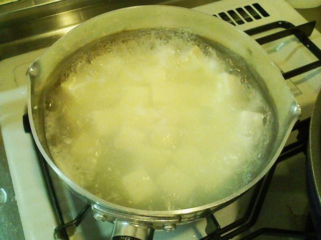 そう!豆腐は豆腐で塩を入れたお湯であらかじめ煮ておきましょう。自分は大目の塩(大さじ一杯くらい)を入れたお湯で弱火で豆腐が浮かんでくるぐらい煮ます。こうすることによって、豆腐がプリッといい食感になるんです。ちょっと一手間のコツですね。