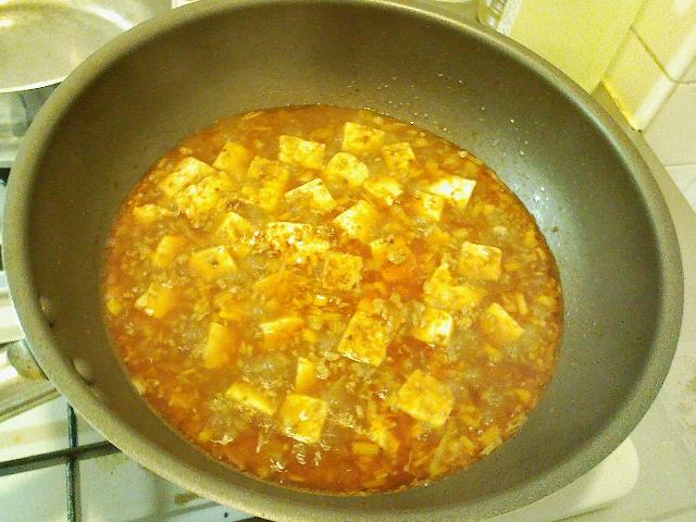 かといって、焦げつかないよう、また、豆腐があまり崩れないよう、大きくかき混ぜて行くのがコツ。